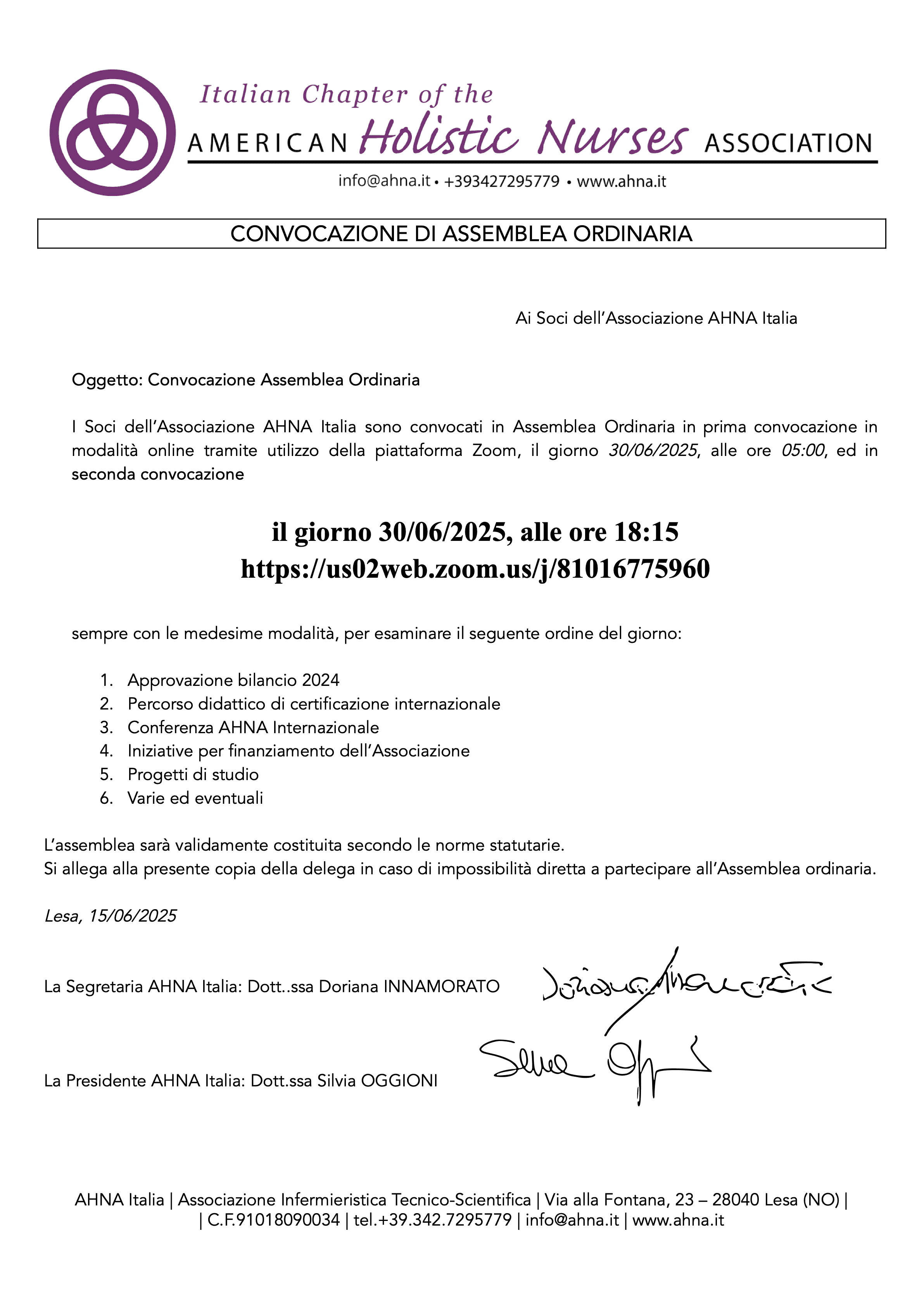 I Soci dell’Associazione AHNA Italia sono convocati in Assemblea Ordinaria in prima convocazione in modalità online tramite utilizzo della piattaforma Zoom, il giorno 30/06/2025, alle ore 05:00, ed in seconda convocazione